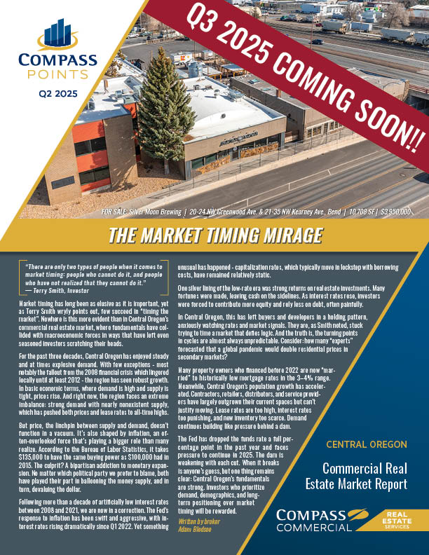 Explore why timing the market may be a losing game in our latest Q2 2025 Compass Points Report on Central Oregon’s commercial real estate trends. Get your FREE copy and discover how strong fundamentals, shifting interest rates, and enduring demand are shaping opportunities for investors ready to think long-term. Compass Points Q3 2025 will be available on October 22nd.